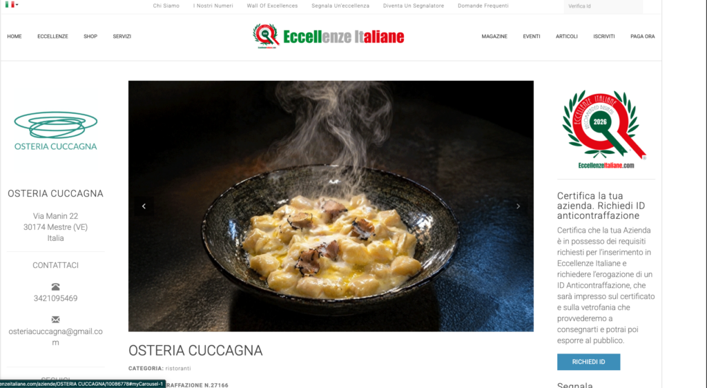 In the heart of Mestre, just steps from the old tower, lies Osteria Cuccagna under the same name since 1775, on a pedestrianized street. Cuccagna is dedicated to the ongoing rediscovery of old dishes from both the Venetian and Venetian traditions. It is also recognized as a local restaurant, specializing in typical and traditional products of the province. It uses Slow Food Presidia products. Inside, it seats 40, and in the summer, it seats 30 outside.